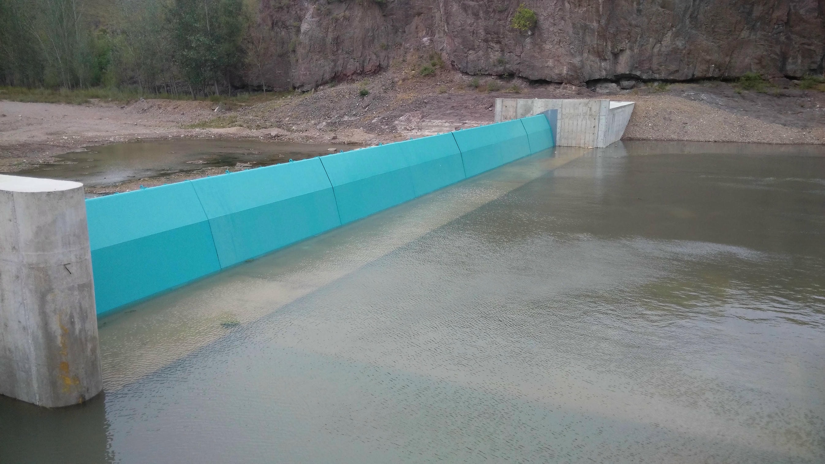 工程介紹:該工程包括42米長、2.5米高的合頁閘及一扇6米長3米高的液壓翻板閘,主要用于景觀蓄水、漂流,并保留當地特有物種中華龜的生態遷移通道。